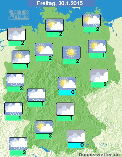 Heute gibt es meist einen Wechsel aus aufgelockerter und oft auch dichter Bewölkung. Dabei sind gebietsweise Schneefälle zu erwarten, vor allem im Stau der Alpen und auch der Mittelgebirge fällt zum Teil langanhaltender und ergiebiger Schnee. Die Temperatur steigt auf 0 Grad in München und bis 3 Grad im Raum Karlsruhe. Es weht dazu häufig frischer und teils starker, in Böen vereinzelt stürmischer Wind.