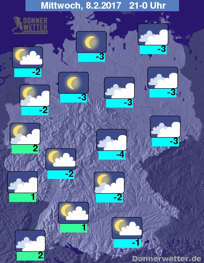Am späten Abend wird es wieder winterlich kalt: Im Norden um minus 3 Grad C und im Süden Temperaturen um den Gefrierpunkt.