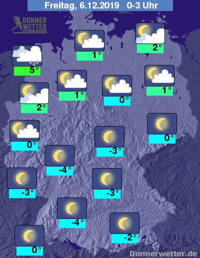 Die Temperaturen sinken in der Nacht im wolkigen Norden auf milde 5 Grad, im Süden Werte um -4 Grad.