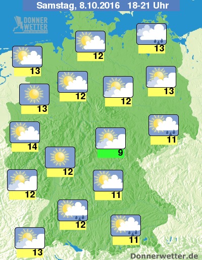 Heute Abend erwarten wir über dem Land meist einen Wechsel aus Sonne und zum Teil jedoch auch dichten Wolken, die im Süden und Osten gebietsweise Schauer bringen. Dagegen ist es in den anderen Landesteilen überwiegend trocken und teils auch sonnig. Die Temperatur liegt bei herbstlichen 9 bis 14 Grad.