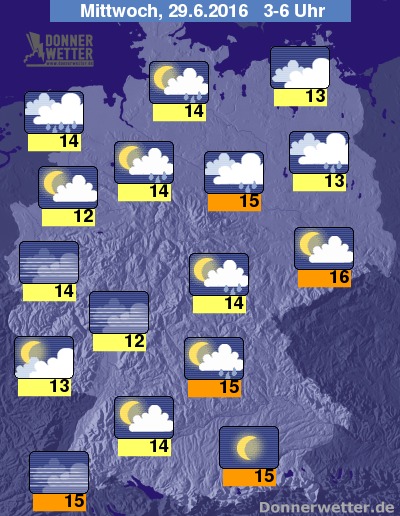 Im weiteren Nachtverlauf zeigt sich der Himmel über Deutschland meist locker oder aufgelockert bewölkt, über dem Erzgebirge kann es auch aufklaren. Mit Schauern muss vor allem zwischen Niederrhein und Hunsrück sowie vereinzelt im Süden gerechnet werden.