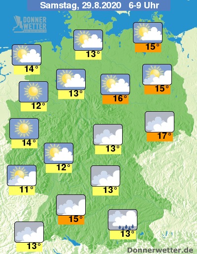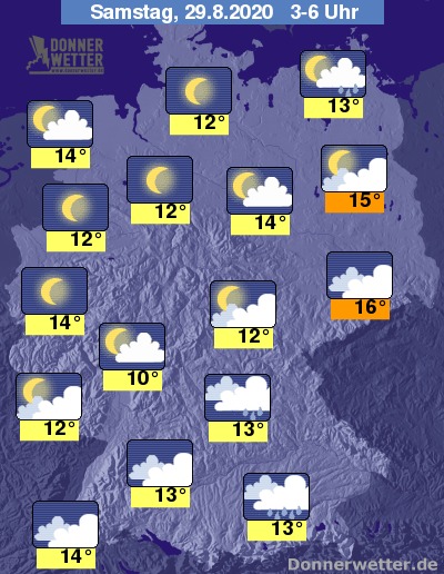In der Nacht bleibt der Himmel im Norden des Landes zunächst noch wechselnd oder stark bewölkt, bevor es in den frühen Morgenstunden von der Eifel bis in die Holsteinische Schweiz auch aufklaren kann. Temporäre Schauer sind meist nur im Umfeld der Küsten zu erwarten. Im Süden bleibt es bei einem meist bedecktem Himmel oder es ist aufgelockert bewölkt, über weiten Teilen Bayerns muss zudem mit Schauern gerechnet werden.
