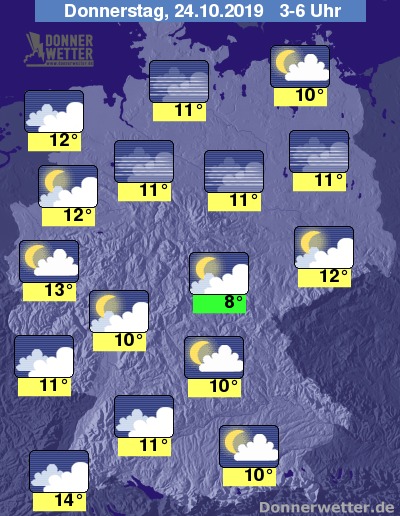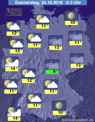 In der Nacht bildet sich vor allem in der Nord- und Osthälfte des Landes verbreitet Nebel. Im Süden und Westen überwiegen anfangs noch lockere Wolken; im weiteren Verlauf nimmt die Bewölkung zu, Schauer sind aber nicht zu erwarten.