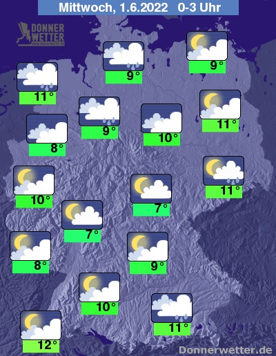 In der Nacht auf Mittwoch sind in der Nordhälfte noch einzelne Schauer und Gewitter möglich. Auch am Alpenrand können anfangs noch ein paar Tropfen fallen. In den übrigen Landesteilen lockern die Wolken im Nachtverlauf häufig auf, teils ist es auch sternenklar, und es bleibt meist trocken.