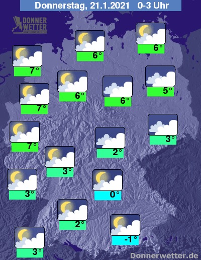 Bis zu den Frühstunden kühlt die Luft verbreitet auf Werte um 8 bis 1 ab, am mildesten bleibt es im Nordwesten. In Bayern, dort wo der Wind nicht so lebhaft bläst, kann es leichten Frost geben und damit auch streckenweise die Gefahr von überfrierender Nässe.