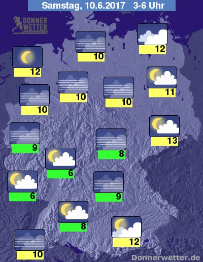 In der kommenden Nacht halten sich über der Osthälfte anfangs meist noch dichte Wolken, sie ziehen mit Schauern und möglichen Gewittern jedoch immer weiter nach Osten ab und zum Morgen hin bilden sich nur noch in den östlichsten Landesteilen mögliche Schauer und vereinzelt noch Gewitter. Im übrigen Bundesgebiet klart der Himmel verbreitet auf oder es ist noch locker bewölkt, dabei bleibt es trocken. Die Temperatur sinkt auf 13 Grad in Dresden und etwa 6 Grad am Pfälzer Wald.