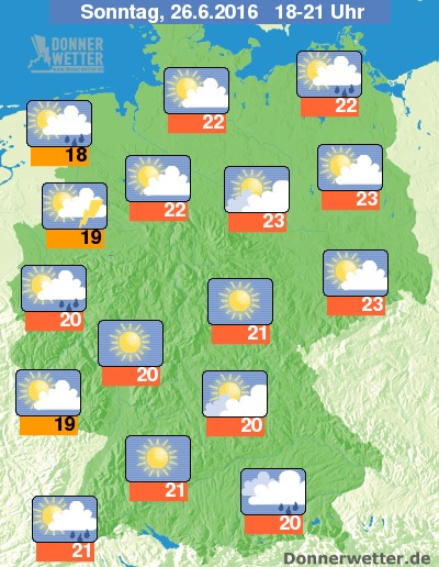 Am Abend, zur Achtelfinalbegegnung zwischen Deutschland und der Slowakei (Anpfiff 18:00 Uhr) bleibt es am Alpenrand und im Südosten meist dicht bewölkt und es fällt hier zeitweise Regen. Einzelne Schauer sind vom Mittel-, Niederrhein bis zur Nordsee und auch an der Ostsee möglich. Sonst scheint aber häufig die Sonne bei meist nur lockerer Bewölkung. Vor allem in der Landesmitte ist es auch sonnig. Dabei bleibt es trocken. Die Temperatur liegt bei 18 Grad in Ostfriesland und 23 Grad in Berlin.