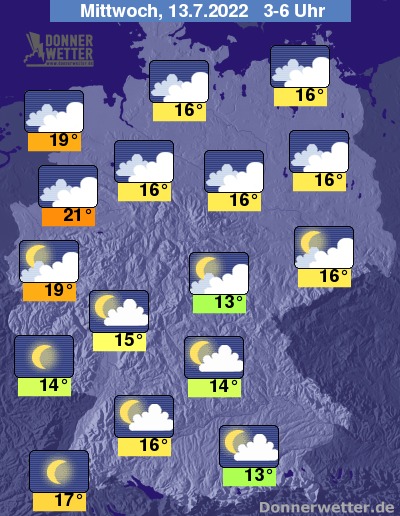 In der kommenden Nacht zeigt sich der Himmel über der Südhälfte des Landes locker bewölkt oder sternenklar, weiter nach Norden hin ist es hingegen überwiegend stark bewölkt, jedoch bleibt es trocken. Die Temperatur sinkt auf teils tropische 21 Grad in Meppen und etwa 13 Grad in München.