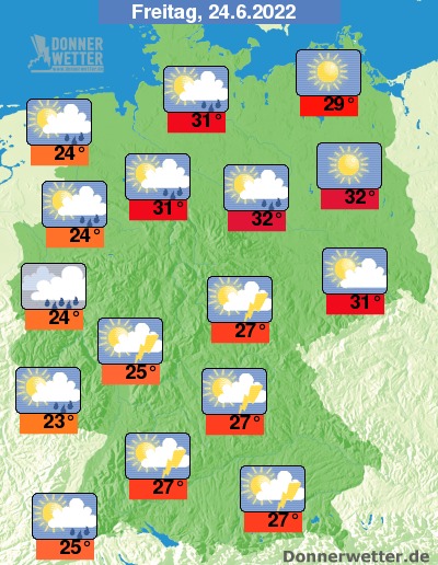 Am Freitag ist es im Norden und Osten zu Beginn noch oft sonnig. Im übrigen Bundesgebiet ist es dagegen schon oft stark, teils aufgelockert bewölkt, dabei bilden sich gebietsweise Schauer, örtlich entwickeln sich Gewitter. Im weiteren Tagesverlauf zieht es sich auch im Norden und Osten mehr und mehr zu, dabei bleibt es aber meist trocken. Die Temperatur steigt auf 23 Grad im Saargau und bis auf 32 Grad in der Magdeburger Börde.