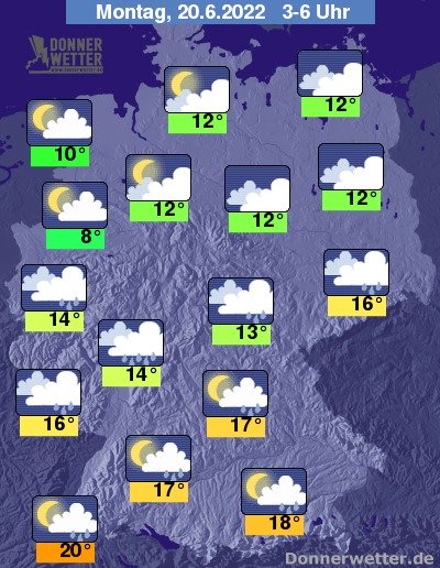 In der folgenden Nacht zieht häufig starke, vor allem im Norden größtenteils aufgelockerte Bewölkung durch, hier bleibt es weitgehend trocken. Weiter nach Süden hin bilden sich hingegen vielerorts Schauer und örtliche Gewitter. Die Temperatur sinkt auf tropische 20 Grad in Freiburg und bis 8 Grad in Meppen.