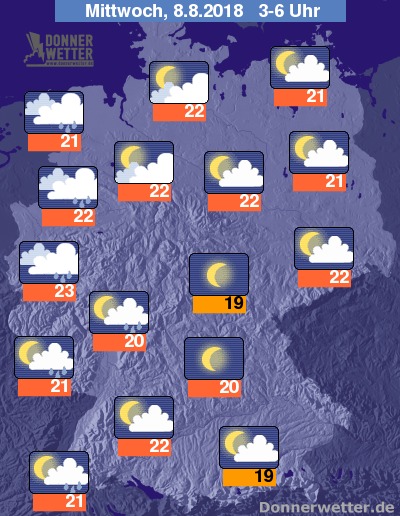 In der folgenden Nacht bleibt der Himmel etwa über der Osthälfte meist locker bewölkt oder sternenklar, dazu bleibt es hier trocken. Im übrigen Bundesgebiet ziehen dagegen meist dichte Wolken auf, die vielerorts auch Schauer und örtlich schwere Gewitter bringen. Die Temperaturen bleiben mit Werten zwischen 23 und 19 Grad weitgehend tropisch.
