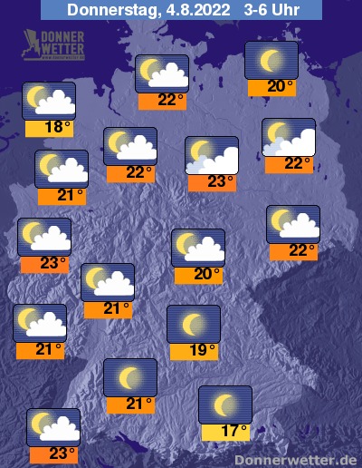 In der Nacht zum Donnerstag zeigt sich der Himmel im Süden weitestgehend sternenklar. Im übrigen Land ist es teils auch sternenklar, zumeist jedoch locker bewölkt, dazu bleibt es trocken. Die Temperatur sinkt auf tropische 23 Grad in Freiburg und Magdeburg und bis 18 Grad in Wilhelmshaven.