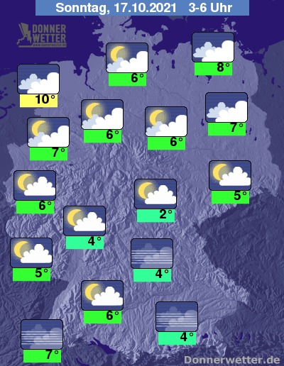 In der Nacht zum Sonntag zeigt sich der Himmel über dem Süden Deutschlands meist sternenklar. Über der breiten Landesmitte ist es zunächst meist locker bewölkt oder sternenklar, jedoch kann sich der Himmel hier im Laufe der Nacht gebietsweise beziehen. Meist stark bewölkt bleibt es im Norden des Landes, zudem sind im Nordseeumfeld einzelne Schauer möglich, im übrigen Bundesgebiet bleibt es aber trocken. Die Temperatur sinkt auf 10 Grad in Cuxhaven und bis 2 Grad in Erfurt.