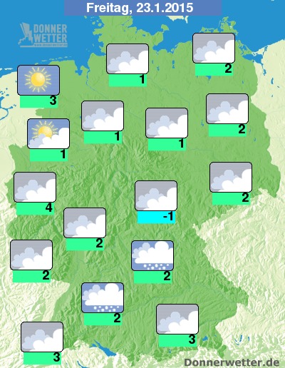 Heute bleiben die Wolken vor allem im Süden und Osten Deutschlands weitgehend dicht und hier fällt zeitweise auch Schnee, vereinzelt auch Schneeregen oder Regen. Auch in der Nordwesthälfte bleibt es mehrheitlich stark bewölkt, hin und wieder, und hierbei insbesonders im Nordwesten kann sich die Sonne aber zeigen. Dabei bleibt es trocken. Die Höchstwerte erreichen -1 Grad im Vogtland und bis etwa 3 Grad in München.