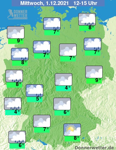Heute Nachmittag ist es weitgehend bedeckt oder trüb, dabei fällt zeitweise Regen oder es bilden sich einzelne, teils kräftige Schauer. Die Temperatur liegt bei 4 Grad im Thüringer Becken und etwa 9 Grad im nördlichen Emsland. Es weht ein verbreitet stürmischer Wind. An der See und auf den Bergen herrscht oft Sturm.