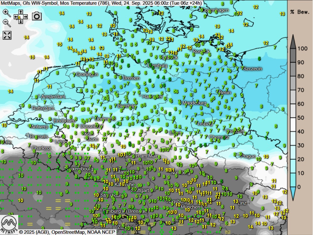Die Wetter- und Temperaturkarte für Mittwochfrüh (06:00 Uhr) und die 24-Stunden-Regenmengen am Mittwoch nach GFS: