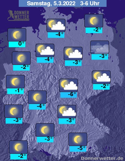 Die Temperaturen liegen in den Frühstunden bei Werten um -6 Grad im Thüringer Becken, -3 Grad an der Spree und um 0 Grad in Ostfriesland.