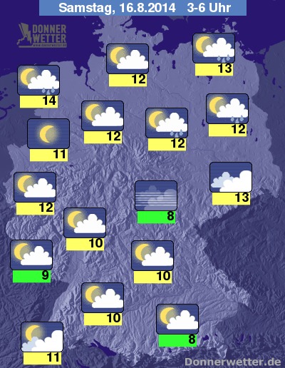 In der Nacht zum Samstag fallen zunächst noch zeitweise weitere Schauer, Gewitter treten seltener auf, ab der zweiten Nachthälfte lässt auch die Schauerneigung spürbar nach, so dass es dann nur noch vereinzelt zu Schauern kommen kann, sonst bleibt es meist trocken. Die Temperatur sinkt auf 14 Grad an der nördlichen Ems und 8 Grad im Allgäu.