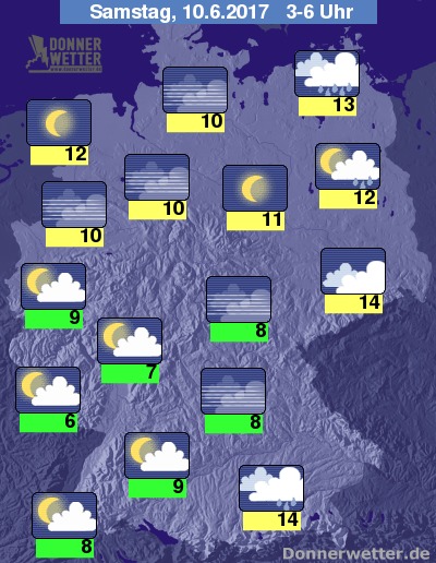 In der Nacht zum Samstag ziehen die dichten Wolken mit Schauern und möglichen Gewittern immer weiter nach Osten ab und zum Morgen hin bilden sich nur noch in den östlichsten Landesteilen mögliche Schauer und vereinzelt noch Gewitter. Im übrigen Bundesgebiet klart der Himmel verbreitet auf oder es ist noch locker bewölkt, dabei bleibt es trocken. Die Temperatur sinkt auf 14 Grad in Dresden und etwa 6 Grad am Pfälzer Wald.