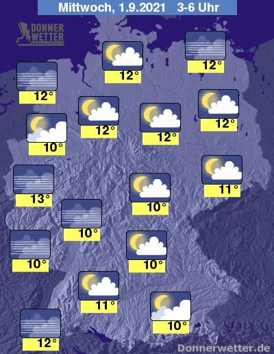 In der folgenden Nacht zeigt sich der Himmel über Deutschland locker bewölkt und oft auch sternenklar. Hier und da, vor allem über dem Ostseeumfeld, Bayern und Sachsen halten sich auch teils dichtere Wolken, dazu bleibt es trocken. Die Temperatur sinkt auf 13 Grad in der Kölner Bucht und bis 10 Grad in Mittelfranken.