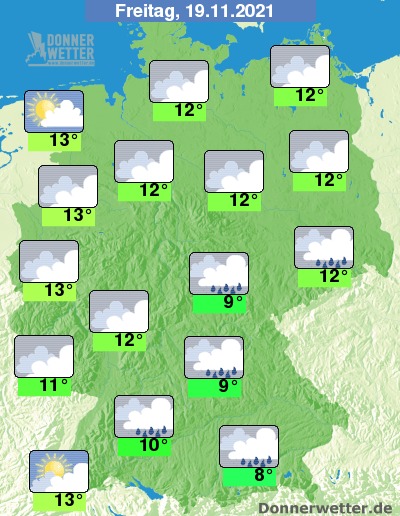 Am Freitag bleibt es verbreitet dicht bewölkt oder neblig-trüb, hier und da fällt zudem Sprühregen. Die Temperatur erreicht 8 Grad in Augsburg und bis 13 Grad in Düsseldorf. An der See weht zudem ein oft stürmischer Wind.