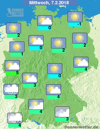 Ganz im Süden unseres Landes dominieren die Wolken, Schnee fällt allerdings nur ganz vereinzelt. Im Tagesverlauf beginnt es im südöstlichen Bayern leicht zu schneien. Im großen Rest scheint abgesehen einiger lockerer Wolkenfelder verbreitet die Sonne. Nach teils eisiger Nacht erwärmt sich die Luft bis zum Nachmittag auf -1 bis 5 Grad. Der Wind weht dabei nur schwach bis mäßig.