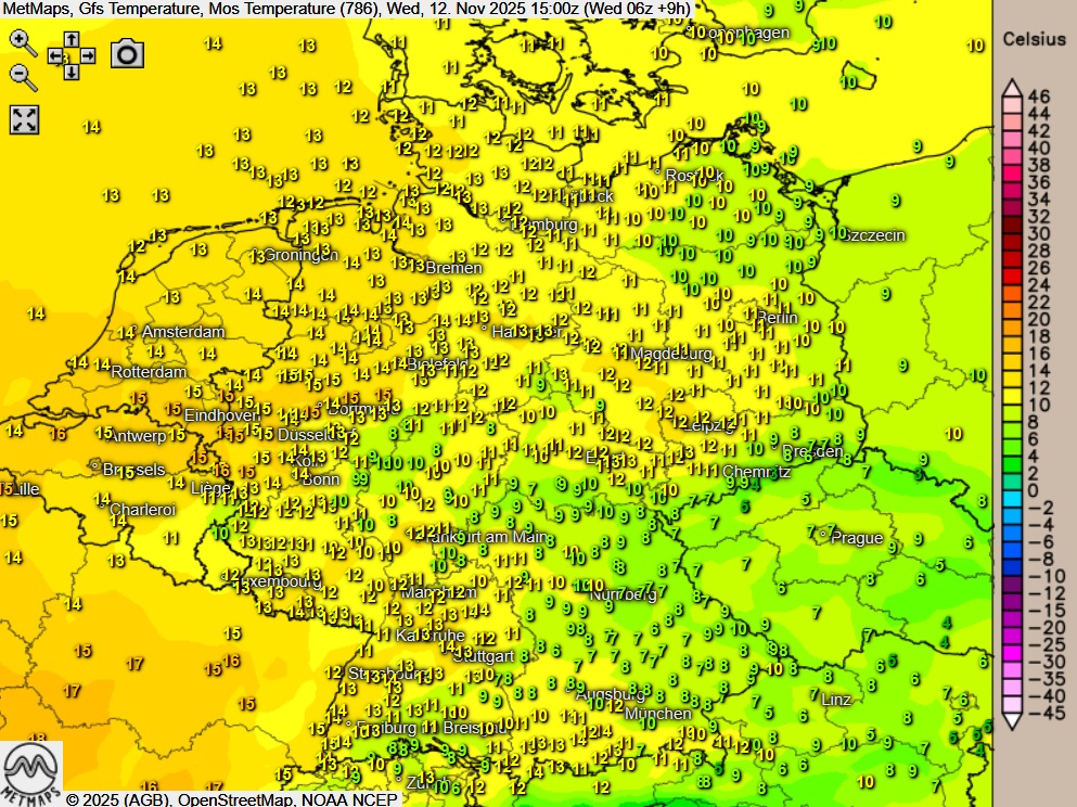 Die Temperaturen am Nachmittag sehr milde 10 bis 16 Grad.