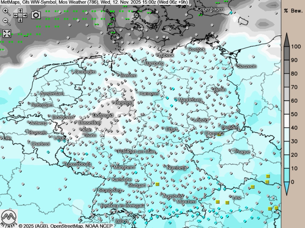 Am Mittwochnachmittag ziehen über den Norden und Nordwesten zeitweise dichtere Wolken hinweg, es bleibt aber meist trocken. In den übrigen Landesteilen ist es abseits von zähem Nebel oder Hochnebel heiter oder die Sonne scheint von einem wolkenlosen Himmel.
