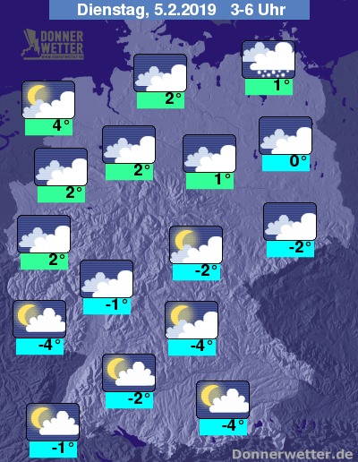 Die Temperaturen sinken auf Tiefstwerte um 3 Grad C in Emden und um -6 Grad C im Alpenvorland.