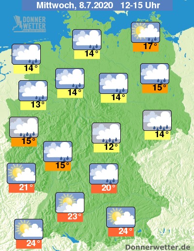 Die Temperaturen bewegen sich unter den dichten Regenwolken nur zwischen 12 und 17 Grad, im Süden und Südwesten wird die 20 Grad - Marke jedoch vielfach deutlich überschritten.