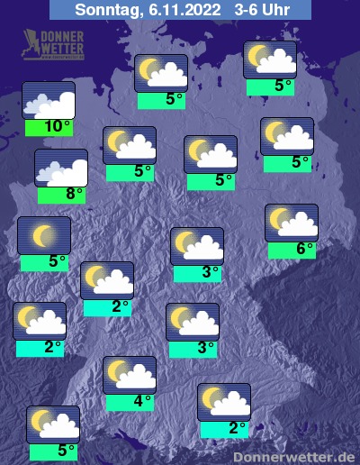 In der folgenden Nacht ist der Himmel über dem Land verbreitet locker, hier und da auch wechselnd bis aufgelockert bewölkt. Im Nordwesten halten sich überwiegend dichte Wolken, die aber kaum Regen bringen. Im übrigen Land bleibt es trocken bei Tiefstwerten von 10 Grad in Wilhelmshaven und etwa 2 Grad in Saarbrücken.