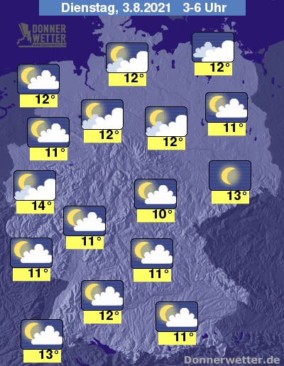 In der folgenden Nacht klingen letzte Schauer überwiegend rasch ab, dazu lockert und klart der Himmel zum Großteil auf. Vor allem im Westen und Süden sowie im Umfeld der Küsten halten sich aber auch oft viele und teils dichte Wolken, dabei sind bis zum Morgen seltene Schauer möglich. Die Temperatur sinkt auf 14 Grad in der Kölner Bucht und bis 10 Grad im Vogtland.