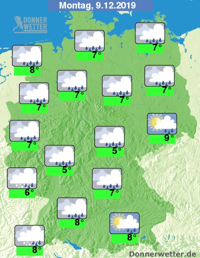 Der Montag bringt weiten Teilen des Landes dichte Wolken, einzelne Auflockerungen sind im Tagesverlauf nur im äußersten Südosten sowie am Alpenrand zu erwarten. Immer wieder fällt am Montag Regen, in den höheren Lagen des Südwestens auch Schneeregen. Der Wind weht mäßig bis frisch, in Böen auch stürmisch.