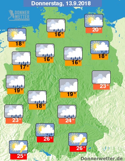 Heute scheint ganz im Norden, sowie im Küstenbereich wieder häufiger die Sonne und Schauer bleiben die Ausnahme. Weiter südlicher halten sich kompakte Schichtwolken aus denen zeitweise Regen fällt. Die Höchsttemperaturen erreichen dabei meist nur 16 bis 22 Grad. Im Süden ist es zunächst noch freundlich. Mit kräftiger Sonneneinstrahlung klettern die Temperaturen nochmals auf spätsommerliche 23 bis 28 Grad. Ab dem späten Vormittag werden die Quellwolken aber immer zahlreicher und mächtiger und produzieren Schauer und Gewitter, die örtlich wieder unwetterartig und in Begleitung von Starkregen, sowie Hagel ausfallen können.