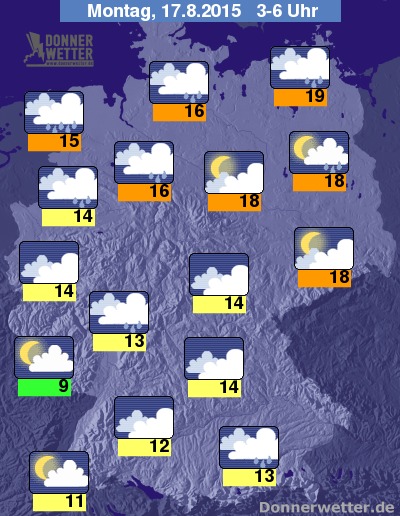 Im Süden und Osten bleibt es bei bedecktem Himmel auch häufiger trocken. Die Temperaturen erreichen Tiefstwerte um 18 an der Küsten bis 9 Grad in den Mittelgebirgen.