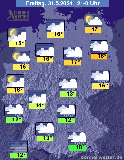 In der Nacht auf Samstag bleibt es im Norden und Westen bei wechselnder bis starker Bewölkung weitgehend niederschlagsfrei, im Süden und Südosten setzt sich ergiebiger Dauerregen fort. Vorsicht Unwettergefahr!