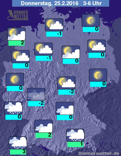 Am Donnerstag bleibt es über dem Alpenvorland bedeckt und es fällt zeitweise Schnee. Im Norden ist es mehrheitlich stark bewölkt und es bilden sich gebietsweise Schneeschauer. Im übrigen Bundesgebiet ist es dagegen zumeist heiter bis sonnig, hier und da ist es auch wolkiger, dazu bleibt es jedoch trocken. Die Temperatur steigt auf 3 Grad am Odenwald und bis 6 Grad im Rheinland.