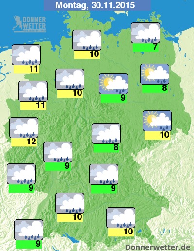 Am Montag ist es vormittags in einem breiten Streifen von Niedersachsen, über Sachsen-Anhalt bis nach Brandenburg und Sachsen meist trocken und teils aufgelockert bewölkt, sonst bleiben die Wolken im Land jedoch verbreitet dicht und es fällt immer wieder, teils langanhaltender und auch ergiebiger Regen. Die Höchstwerte liegen bei 7 Grad an der Müritz und um 12 Grad im Rheinland. Der Wind weht oft stürmisch mit teils noch schweren Sturmböen, auf den Bergen und an den Küsten sind orkanartige Böen möglich.