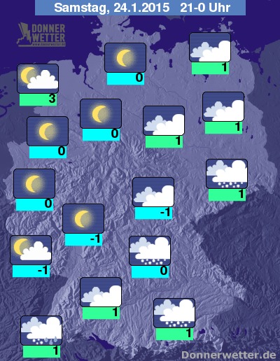 Heute Abend fällt im Süden und Osten der Bundesrepublik immer wieder Schnee, von Westen her klart der Himmel dagegen immer weiter auf, so dass voraussichtlich gegen Mitternacht nahezu die gesamte Westhälfte des Landes, mit Ausnahme von südlichen Baden-Württemberg, sternenklar sein wird. Gebietsweise können jedoch auch dichtere Wolken durchziehen, Schneefall ist dabei jedoch ebenfalls nur im südlichen Baden-Württemberg zu erwarten, sonst bleibt es trocken. Die Abendtemperatur liegt bei 3 Grad in Ostfriesland und um -1 Grad am Pfälzer Wald.