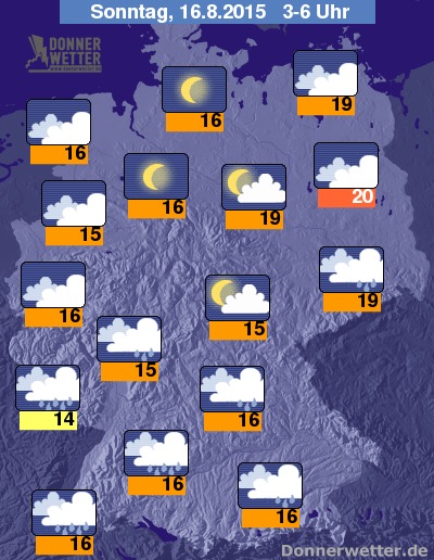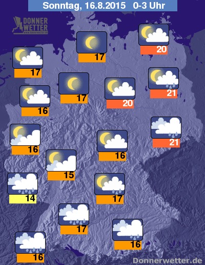 In der kommenden Nacht auf den Sonntag sind im Süden und im Osten Deutschlands mit Schauern und Regenfällen zu rechnen. Im Westlichen Teil zeigt der Himmel sich sonnig und teils bewölkt. Die Temperaturen sinken auf 21 Grad C an der Oder und auf etwa 14 Grad C im Pfälzer Bergland.