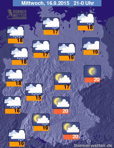 Detailiertere Informationen zum Niederschlag erhalten Sie über den Regenscanner. Die Abendtemperatur liegt bei 20 Grad in Leipzig und etwa 15 Grad am Westerwald. Dazu weht im Norden und Westen ein teils frischer bis starker, im Nordseeumfeld auch ein stürmischer Wind mit möglichen Sturmböen.