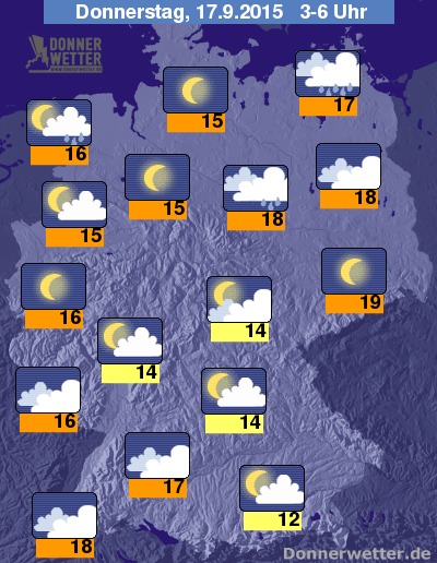 In der Nacht zum Donnerstag ziehen über den Nordosten Deutschland meist noch dichte Wolken, dabei fällt teils noch kräftiger und anhaltender Regen. Auch über dem Südwesten ist es oft dichte bewölkt und hier und da ist Regen möglich. Einzelne Schauer bilden sich zudem im Nordseeumfeld. In den übrigen Landesteilen zeigt sich der Himmel hingegen oft locker bewölkt und vielerorts sogar sternenklar, dazu bleibt es weitgehend trocken. Die Temperatur sinkt auf 19 Grad in Dresden und bis etwa 12 Grad in München. Im Nordwesten weht ein frischer bis starker Wind mit stürmischen Böen, an der Nordsee ist es oft stürmisch und es herrscht zum Teil auch Sturm.