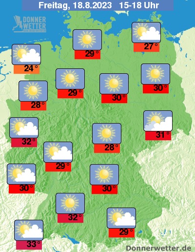 Die Temperaturen erreichen verbreitet Werte um 29 bis 33 Grad, an den Küsten bleibt es mit 24 bis 27 Grad ein wenig kühler.