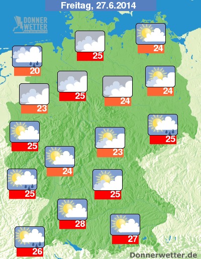Von den Niederlanden, Belgien und Frankreich ziehen zunehmend auch dichtere Wolken auf und in den westlichsten Regionen des Landes sind am Nachmittag und Abend Schauer und Gewitter möglich, sonst bleibt es aber weitgehend trocken. Die Tageshöchsttemperaturen liegen bei 20 Grad im Emsland und rund 28 Grad in Baden-Baden.