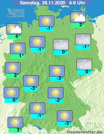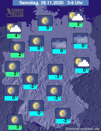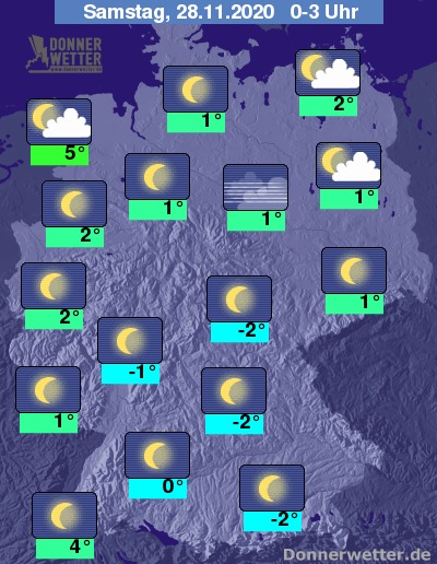 Bis zu den Frühstunden kühlt die Luft auf 4 Grad im Emsland und frostigen -3 Grad im Thüringer Becken ab, stellenweise kann es auch noch etwas kälter werden. Es muss daher verbreitet mit Reifglätte gerechnet werden.