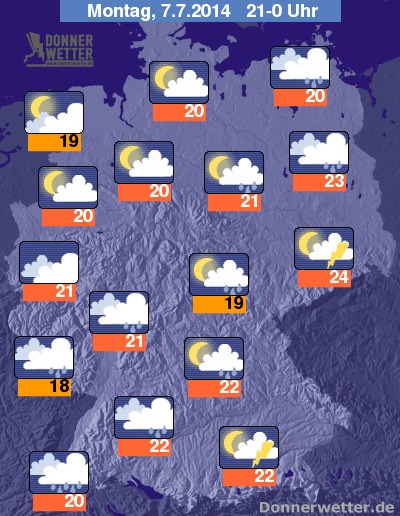 In der Nacht zum Dienstag bleibt der Himmel überwiegend bedeckt und es fällt vielfach, zum Teil gewittriger und ergiebiger Regen. meist trocken bleibt es voraussichtlich im Nord- und Ostseeumfeld. Die Temperatur sinkt auf sehr milde 18 Grad in Berlin und etwas frischere 12 Grad im Pfälzer Wald.