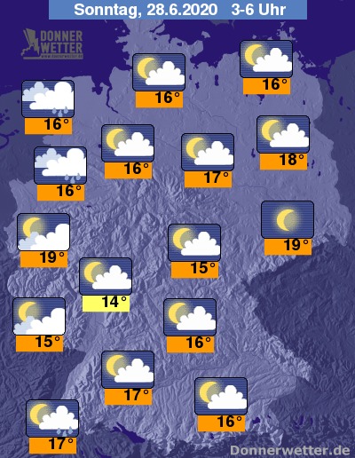 In der Nacht zum Sonntag klingen letzte Schauer und Gewitter verbreitet rasch ab, am Alpenrand und im Südwesten des Landes sind jedoch bis Sonnenaufgang einzelne Schauer und örtlich auch Gewitter möglich. Im übrigen Land ist es teils locker, vor allem nach Nordwesten hin zunehmend stark bewölkt. Vom Niederrhein bis ins Emsland sind zum Morgen hin einzelne Schauer möglich. Die Temperatur sinkt auf 19 Grad in der Kölner Bucht und bis 14 Grad am Taunus.