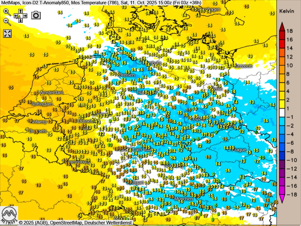 Die Strömungskarte sowie die Temperaturen und Temperaturabweichungen für Samstagnachmittag (15:00 Uhr) nach Icon-D2: