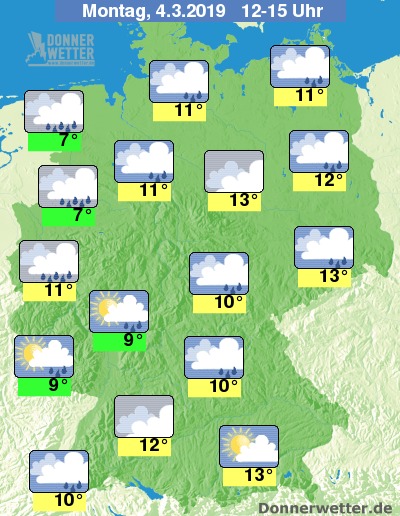Heute Mittag bleibt es im Norden bedeckt und zeitweise regnerisch. Auch in den anderen Bundesländern muss mit zeitweisen Niederschlägen gerechnet werden. Aufheiterungen sind zumal um das Saarland und Oberbayern zu erwarten. Oft weht ein starker bis stürmischer Wind. Die Temperaturen erreichen Werte um 13 Grad C im Erzgebirge und 7 Grad C im Emsland.