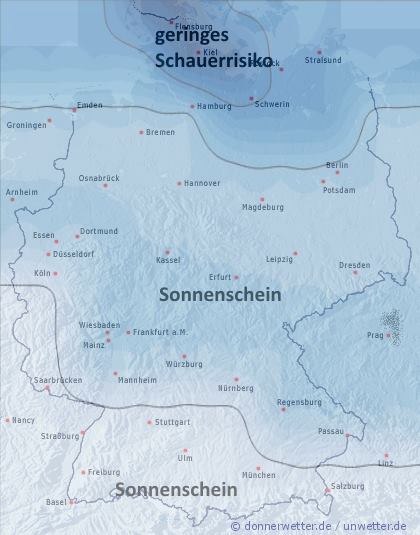 Über weite Strecken sonnig und freundlich zeigt sich der frühe Donnerstagnachmittag. Einzelne harmlose Wolken ziehen zunächst meist nur zwischen Niederrhein und Ostfriesland sowie entlang der Donau und Oder durch.